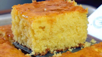Para finalizar, uma calda de laranja com açúcar e suco é adicionada, deixando o bolo bem molhadinho.