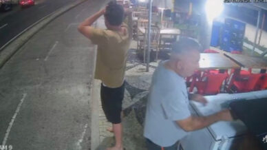 No vídeo, observa-se Bruno de Luca próximo ao Quiosque Dona Maria, localizado no posto 6 da orla da praia da Barra, acompanhado de um funcionário que segura uma máquina de cartão.
