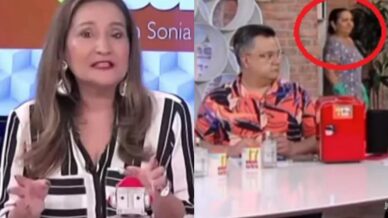 Naquela ocasião, Sonia Abrão e seus colaboradores debatiam sobre a recente separação da cantora Sandy e do músico Lucas Lima. Os jornalistas abordavam a participação do ex-casal na gravação do programa “Altas Horas”, que será transmitido neste sábado (30), na TV Globo. Nesse momento, é perceptível a entrada de uma mulher no estúdio.